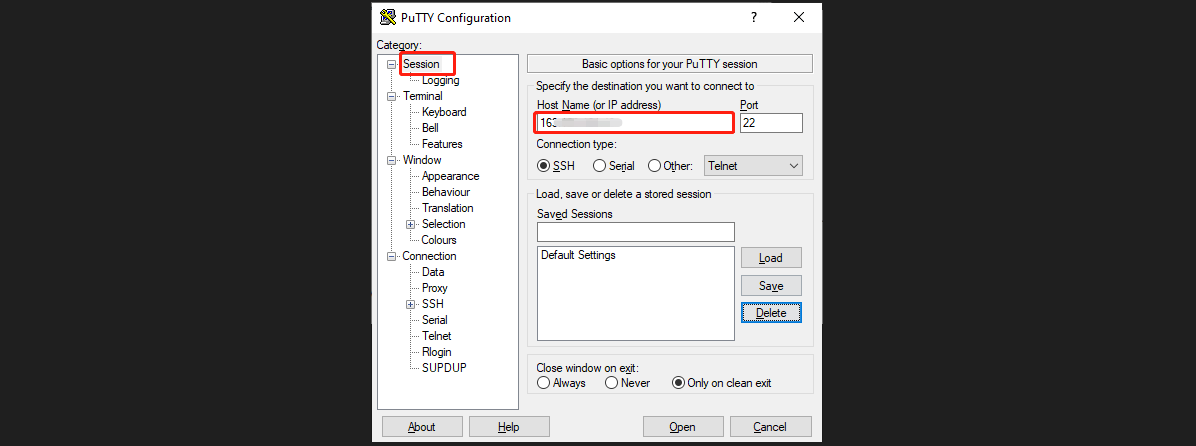 3. In the PuTTY Configuration window, enter the following content as shown in the figure below.