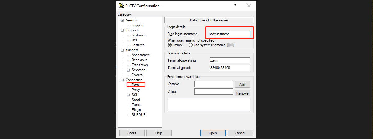 1. Auto-login username: Enter the username you are about to log in to. In this example, we use administrator.