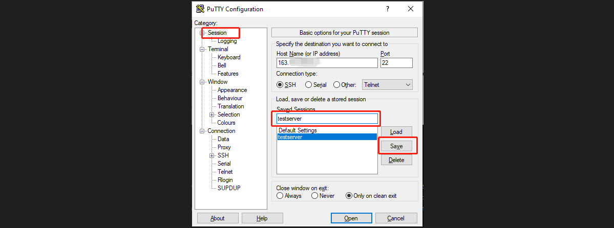 1. Saved Sessions: Configure a name for this session and click Save. Each time, you can directly double-click "Saved Sessions" to log in to the server.